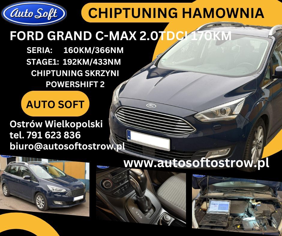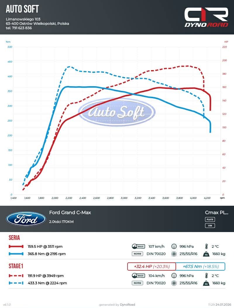 Pomiar serii wykazał, że C-Max dysponuje mocą 160KM i 366Nm. Zmodyfikowaliśmy oprogramowanie sterownika silnika i finalnie otrzymaliśmy 192KM i 433Nm.